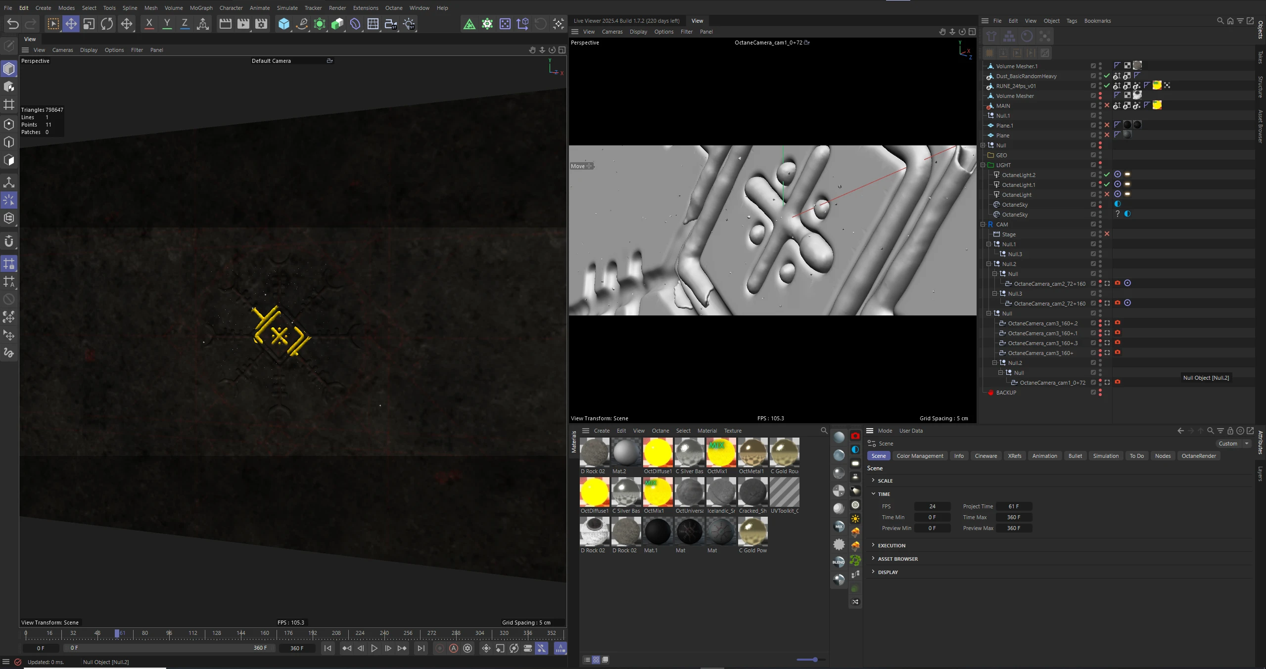 A complex, multi-layered material setup was created to add surface detail and subtle imperfections, enabling realistic light interaction and enhancing the overall cinematic quality.